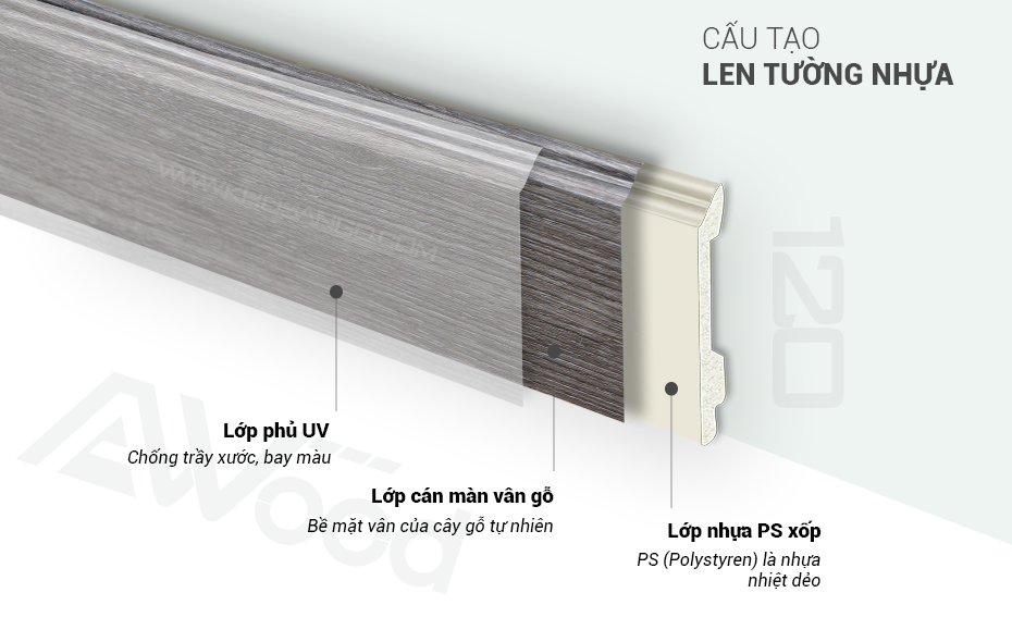 Len tường AWood PS Vân Gỗ: Len tường nhựa nhà máy Hàn Quốc sản xuất 100%, chuyên dùng cho trang trí nội thất và ngoài trời