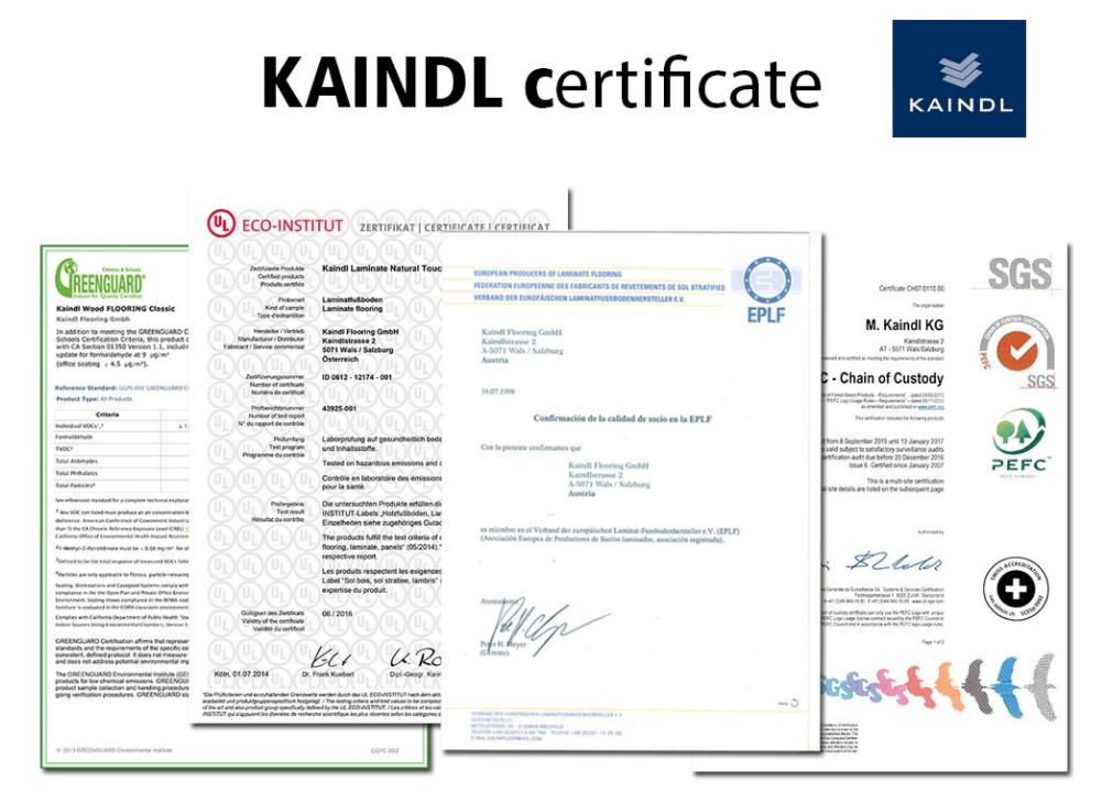 - Sàn gỗ công nghiệp Kaindl đảm bảo tính thân thiện với môi trường sống xung quanh và có khả năng chống tĩnh điện, chống vi khuẩn tự nhiên. Bề mặt có cấp độ chống trầy xước AC4 theo tiêu chuẩn Châu Âu, chỉ số IC2 về khả năng chống va đập, hàm lượng khí thải mức E1.