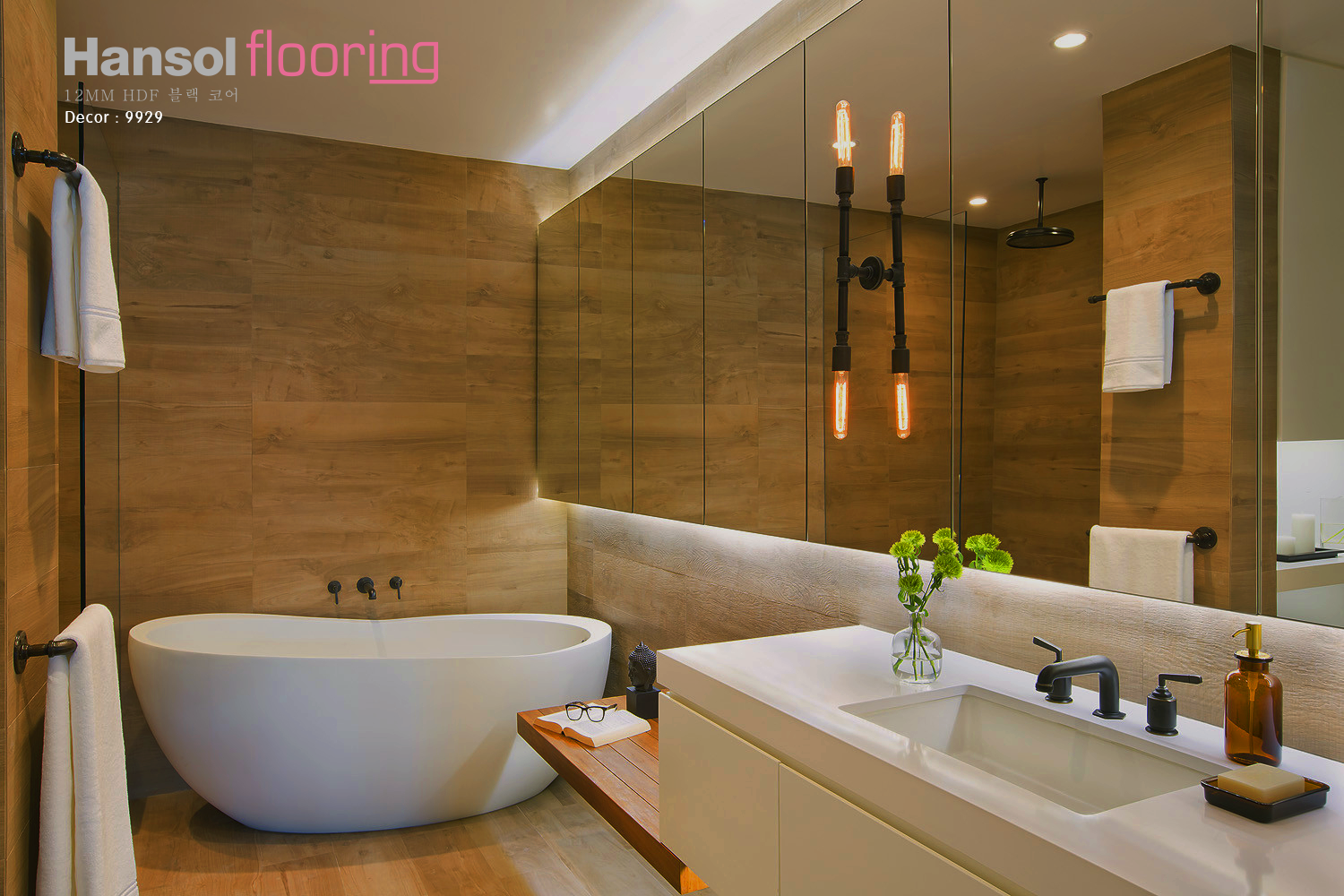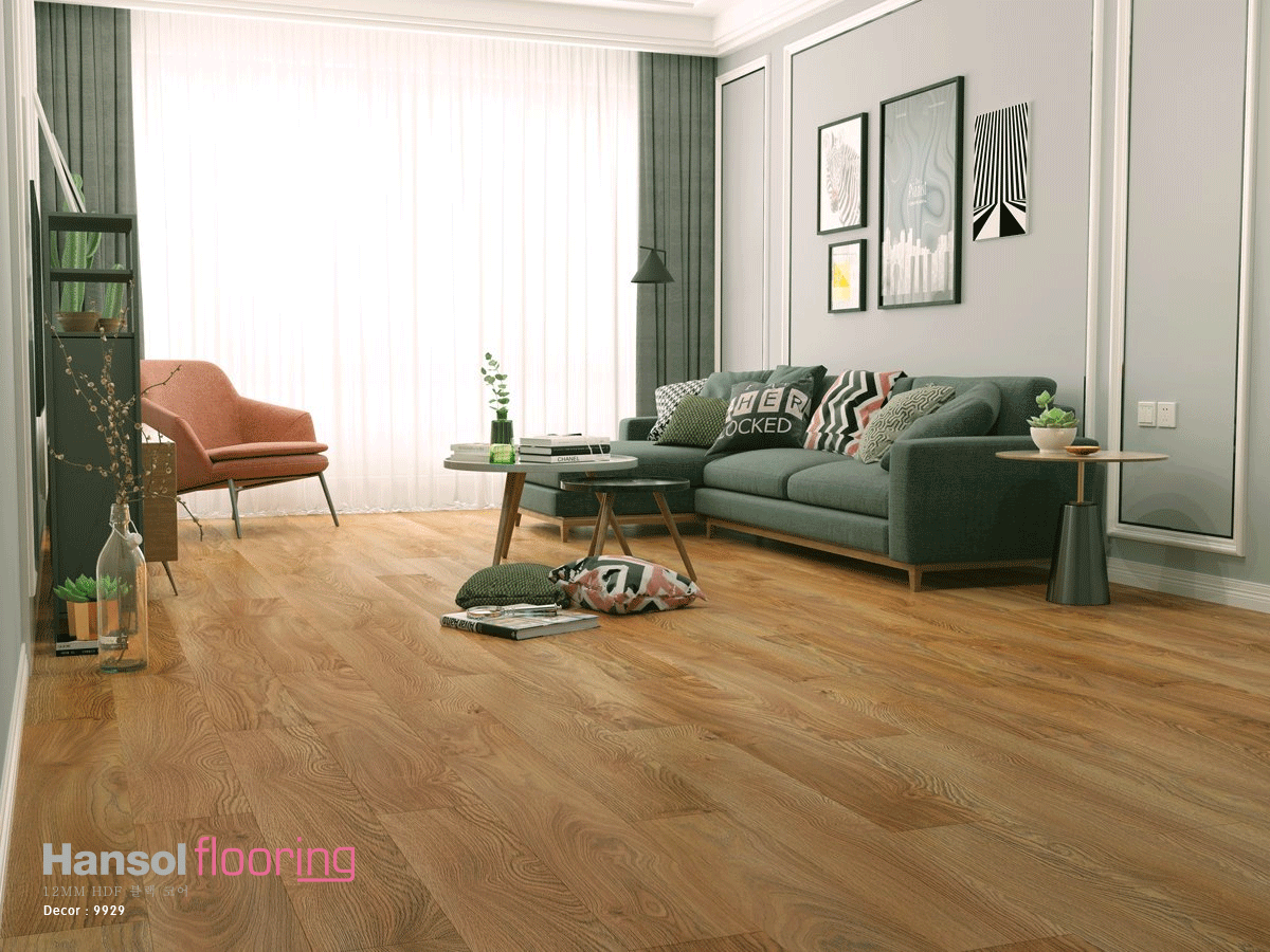 Sàn gỗ HANSOL 9929, HDF 920kg/m3 cốt đen chống ẩm dày 12mm, bề mặt EIR (sần theo vân) Chống mòn AC4