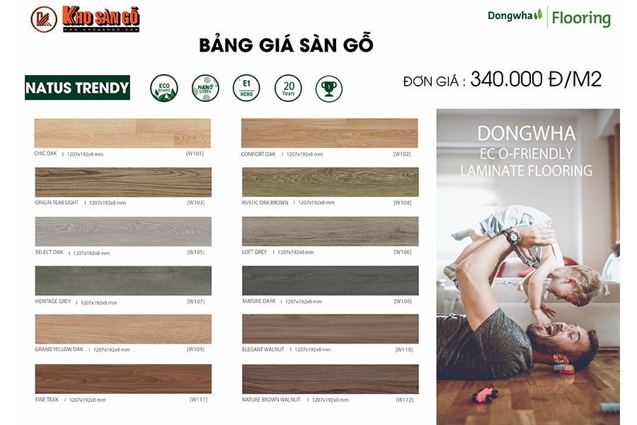 Dongwha sử dụng công nghệ Nano silver phủ bề mặt làm cho vân gỗ thêm tự nhiên hòa nhã . Tác dụng của công nghệ này là ngăn chặn hoàn toàn sự bám bẩn trên bề mặt sàn gỗ và bảo vệ sàn gỗ khỏi các tác động vi sinh. Sàn gỗ Dongwha có độ chịu lực 850kg/cm2, do cốt gỗ được ép sơ gỗ thuần khiết không tạp chất. Dongwha đạt chúng chỉ sàn gỗ không có chất độc hại E0, hoàn toàn tốt cho sức khỏe người sử dụng.