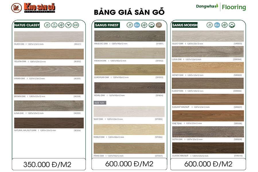 Kho Sàn Gỗ Dongwha 12mm sản xuất tại Việt Nam có 3 Dòng sản Phẩm: