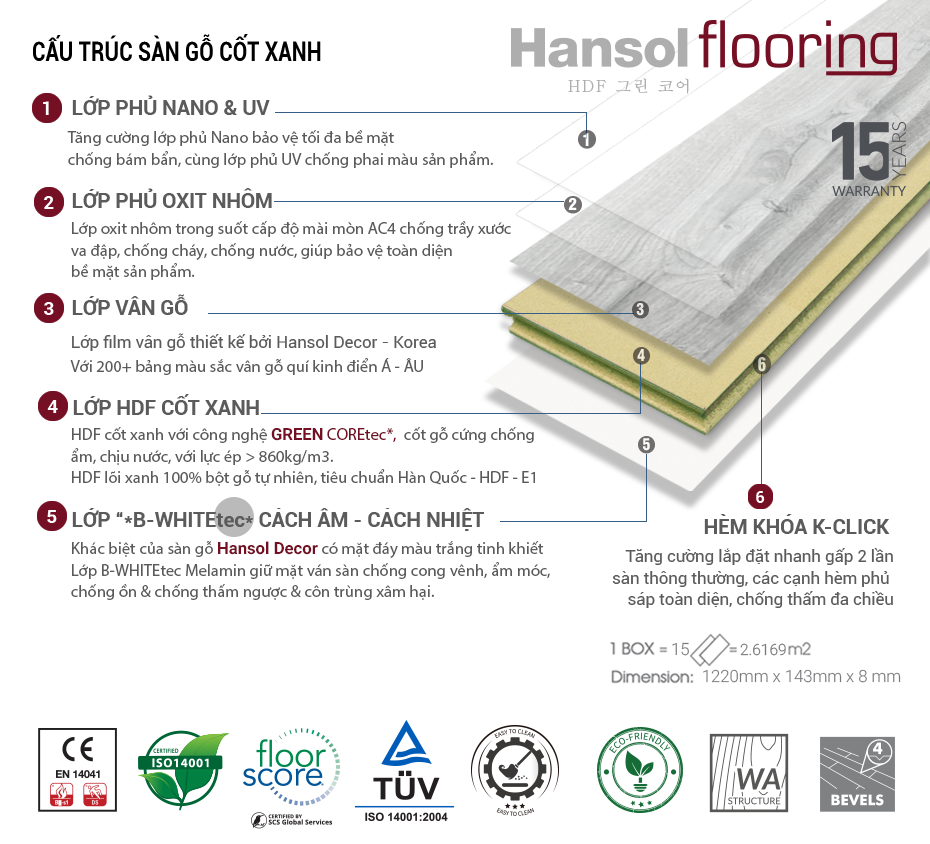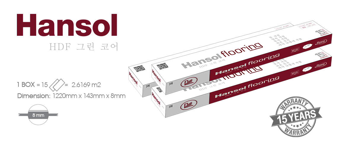 - Sàn gỗ HANSOL 8mm bề mặt được phủ ô xít nhôm chống xước chống cháy .