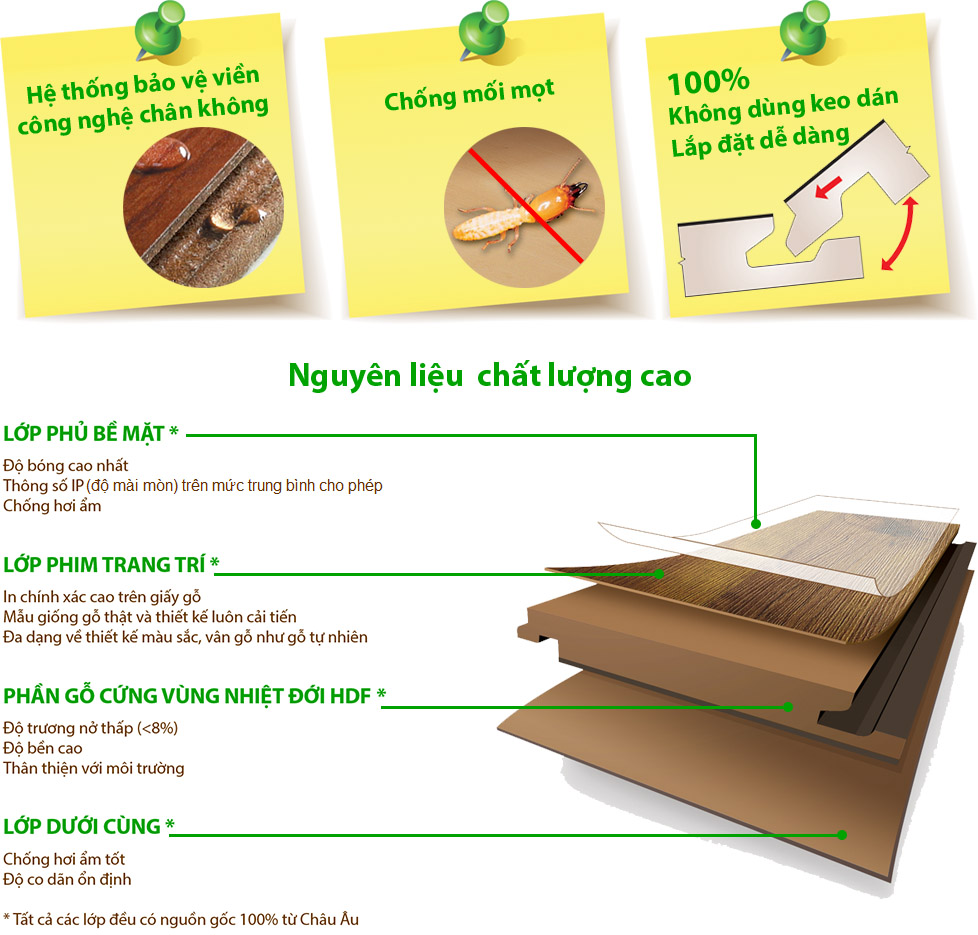 ![]() | Chịu lực, chịu mài mòn cao từ AC4 đến AC5 | ![]() | Khả năng kháng cháy thuốc lá, dễ vệ sinh bảo quản |