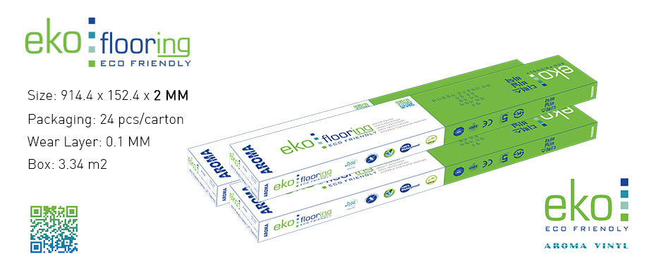 Sàn nhựa AROMA EKO: eco friendly Korea vinyl flooring dày 2mm là dòng sàn nhựa dán keo Aroma LVT tinh tế và mỏng nhất, sử dụng nguyên liệu nhựa tái sinh tiết kiệm năng lượng và thân thiện môi trường. họa tiết vân gỗ được thiết kế và sản xuất tại Hàn Quốc: