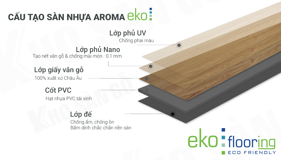 Sàn nhựa Vinyl AROMA EKO sử dụng hạt nhựa PVC tái sinh, là vật liệu xanh tái tạo sống, vật liệu thân thiên môi trường không mùi hôi.